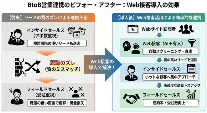 この記事では、インサイドセールスとフィールドセールスの違いと、両者の連携を阻む課題、そしてWeb接客を活用した解決策について解説してきました。改めて、重要なポイントをまとめます。
