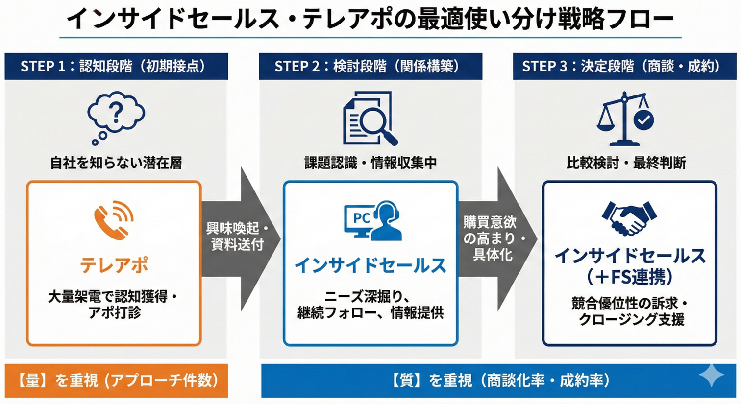 フィールドセールスが失注した際、その理由(時期尚早、機能不足など)をインサイドセールスに必ずフィードバックするルールを作ります。これによりインサイドセールスは「どのようなリードが成約しやすいか」を学習できます。