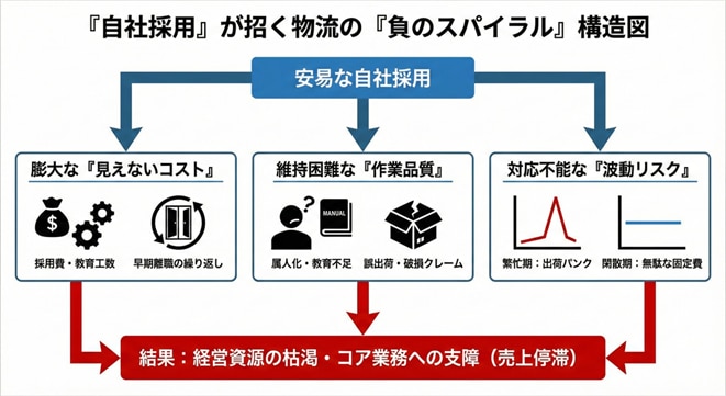 物流の人手不足を自社採用で解決しようとすると、上記のようなコスト、リスク、品質管理の壁に必ず直面します。