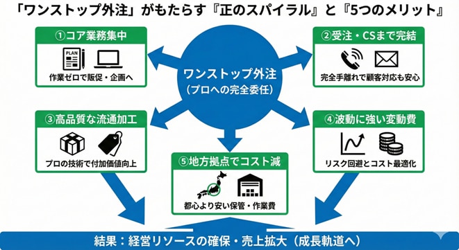 その上で、コア業務に集中し、さらなる売上拡大を目指すための「賢い外注化(ワンストップ物流)」という選択肢について、具体的なメリットと実践方法をご提案します。
