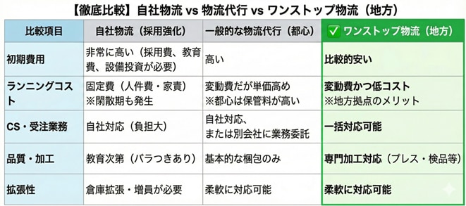 ここでは、自社で物流を行う場合と、一般的な物流代行、そして「ワンストップ型物流(地方拠点)」を利用した場合の比較を整理しました。