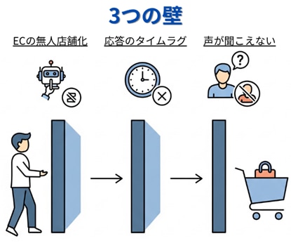 多くの訪問者があるにもかかわらず、購入に繋がらない背景には、オンライン特有の構造的な課題、つまり「3つの壁」が存在します。