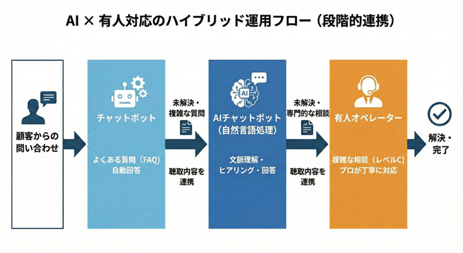 鍵となるのは、AIチャットボットとプロに任せる有人対応を組み合わせた「ハイブリッド運用」です。