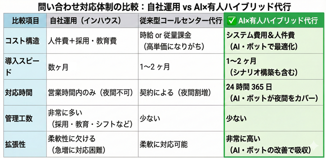 AIでベースの対応量を吸収し、変動する部分をプロのアウトソーサーがカバーする体制こそが、リスクを最小限に抑え、利益を最大化する「次世代のスタンダード」と言えるでしょう。