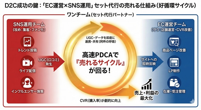 SNS運用のプロチームがデータに基づいて投稿を行い、そこから得られた知見をECサイト側のコンテンツにも反映させることで、初めて「売れるサイクル」が回ります。