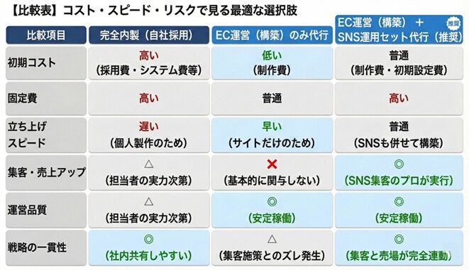 現実的な選択肢として、「①完全内製」「②EC運営(構築)のみ外注」「③EC運営+SNSセット代行」の3つが挙げられます。