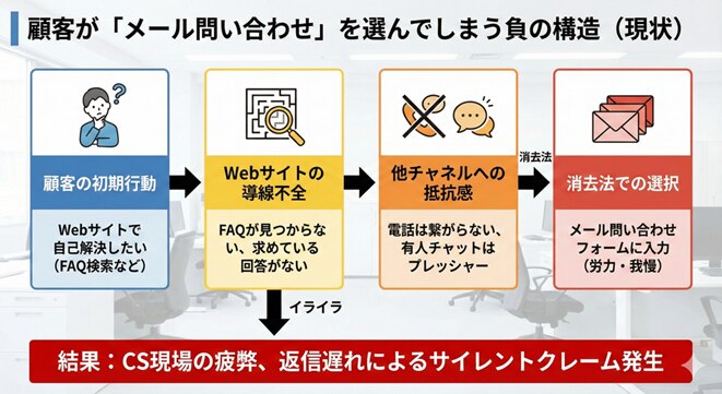 問い合わせ対応においてメールがなくならない最大の原因は、顧客が抱える「解決への不安」とWebサイト上の「導線不全」にあります。