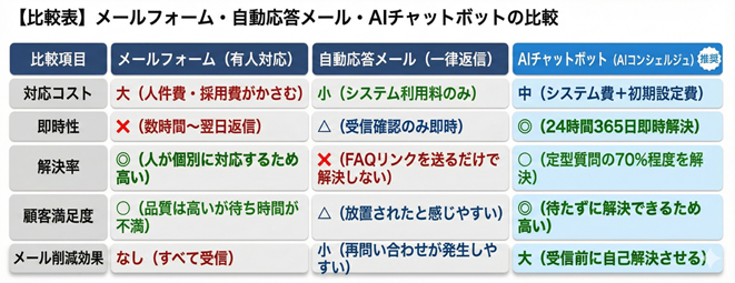 ここでは、従来の「メールフォーム(有人対応)」、簡易的な「自動応答メール」、そして今回推奨している「AIチャットボット」の3つを比較し、なぜチャットボットへの切り替えが進んでいるのかを可視化します。