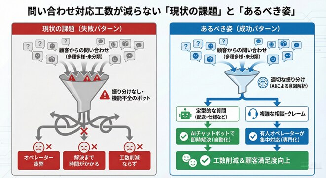 問い合わせ対応の工数が減らない本質的な理由は、ツールがないからではなく、どの問い合わせを自動化し、どの問い合わせを有人に残すべきかという「振り分けの設計」が不十分であることに起因しています。