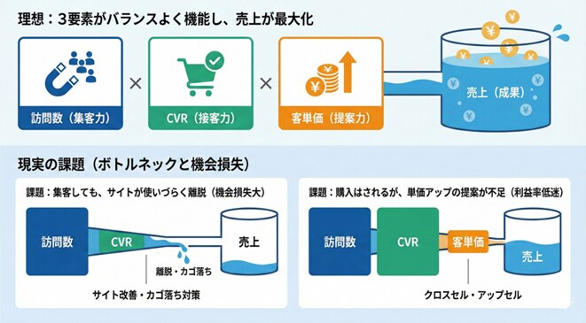 ECの売上は「訪問数× CVR(購入率)×客単価」というシンプルな方程式で成り立っています。