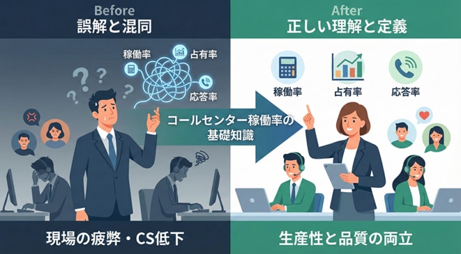 稼働率はセンター全体の効率を、占有率はオペレーター個人の負荷を測るものとして使い分けるのが現場管理の鉄則です。