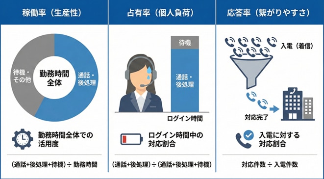 稼働率が「勤務時間全体」を対象とするのに対し、占有率は「ログイン時間(待機時間+対応時間)」に占める「対応時間」の割合を指します。