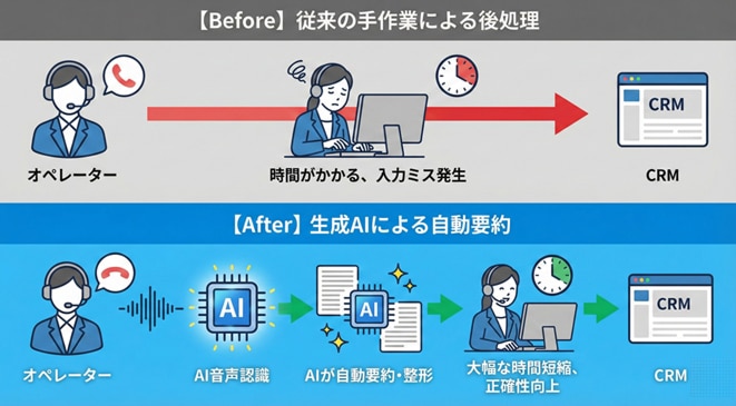 現在、最も導入効果が高く、かつリスクが低い活用法と言われているのが「通話ログの自動要約」です。