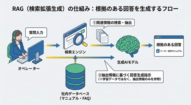 これは、AIが学習済みの知識だけで勝手に回答するのを防ぎ、必ず「社内データベース(マニュアルやFAQ)」を参照させる仕組みです。