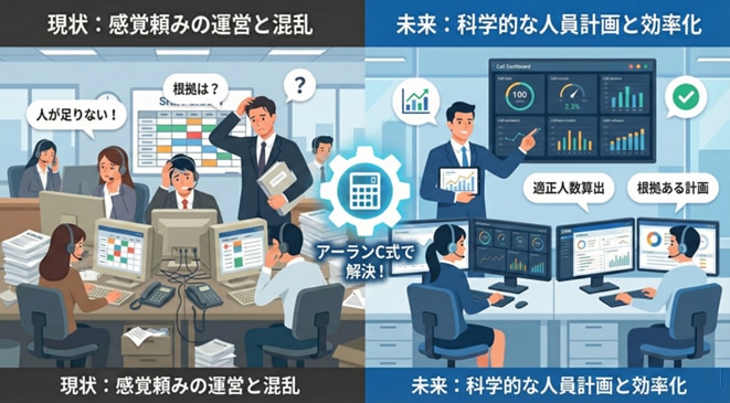 「応答率が上がらないが、これ以上人を増やす予算もない」「現場のSVから人が足りないと言われるが、根拠が曖昧で経営層に説明できない」