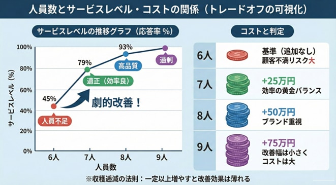 それは、サービスレベルをわずか数パーセント向上させるために、想像以上の追加人員が必要になる「分岐点」が存在することです。