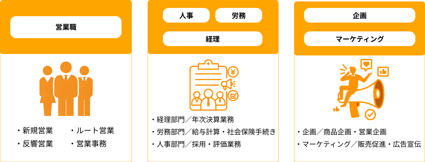 A. | 営業職 ・企画職 ・人事 ・医療、福祉 ・接客など様々な職種をご紹介させていただいております。 |